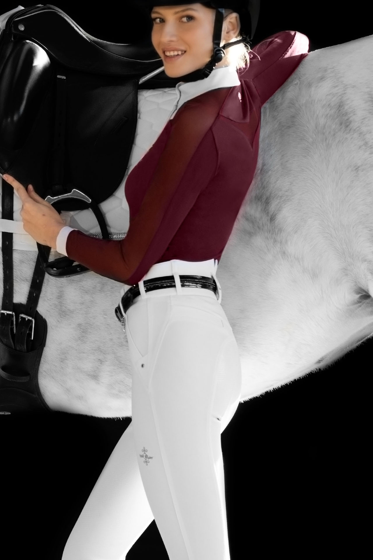 Den velkendte klassiske ridebuks fra Fairplay Jasmine bull Høj talje, klassisk pasform med V-form bagpåbull Skræddersyet, 4-vejs stretchbull Fuld grip sæde med COMFISTICKtrade teknologigrebbull Elastisk ben afslutningbull To skrå