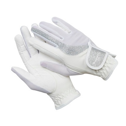 Bløde og elastiske ridehandsker til børn med godt greb. Ridehandskerne har meshstof på en del af oversiden og velcrolukning. Hvide med sølvglimmer detaljer.