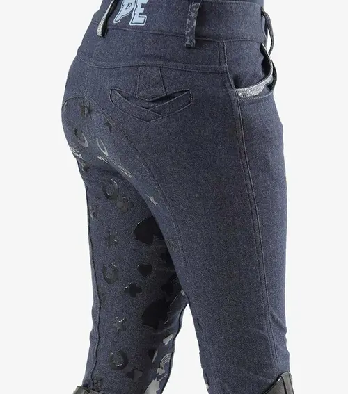 Premier Equine Sabrina ridebukser til børn i trendy denim-look. Et fuldt sæde i fint mønstret silicone gel hjælper med at give et sikkert sæde, og to traditionelle frontlommer foret med glitterdetaljer pryder forsiden af ridebukserne. Sødt My First